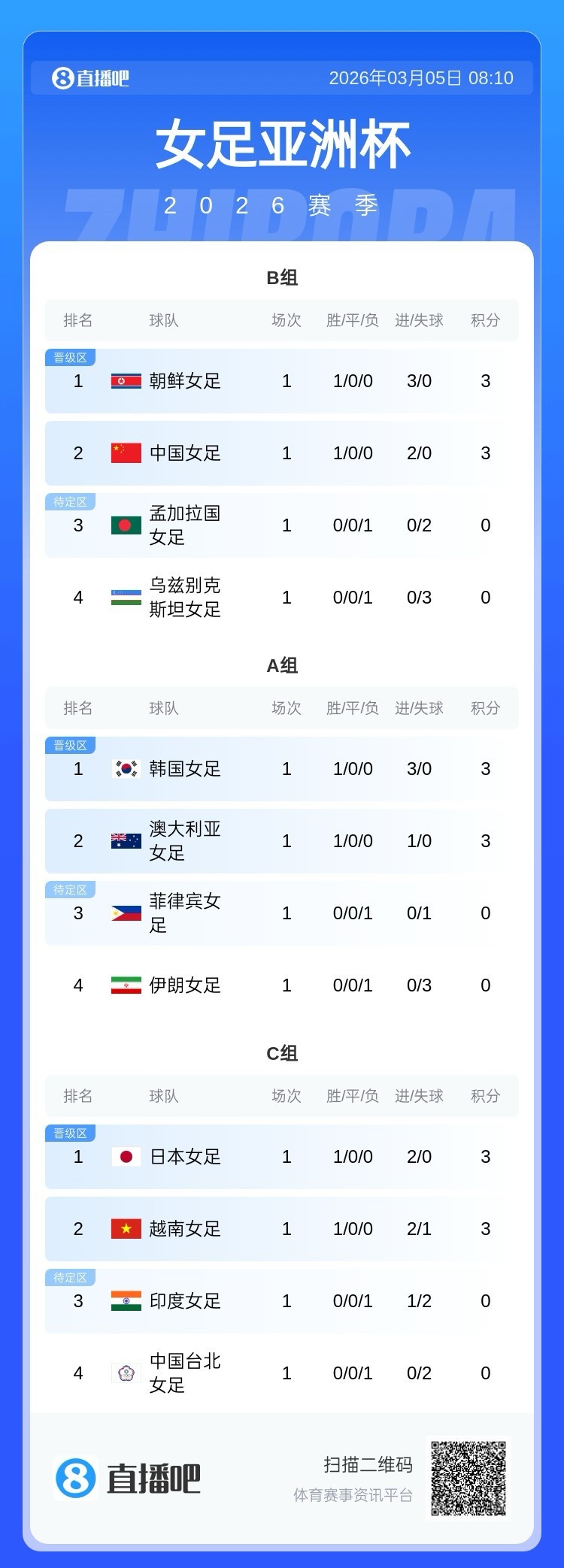 A组方面,韩国女足3-0击败伊朗女足,澳大利亚女足1-0菲律宾女足,韩国女足因净胜球优势排在A组头名,澳大利亚女足随后。