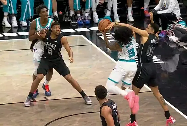 虎扑04月01日讯 NBA常规赛,黄蜂对阵篮网的比赛正在进行中。第四节比赛中,米诺特防守下压直接打到怀特面部,裁判回看吹罚一级恶意。来源:虎扑 虎扑04月01日讯 NBA常规赛,黄蜂对阵篮网的比赛正在进行中。第四节比赛中,米诺特防守下压直接打到怀特面部,裁判回看吹罚一级恶意。来源:虎...