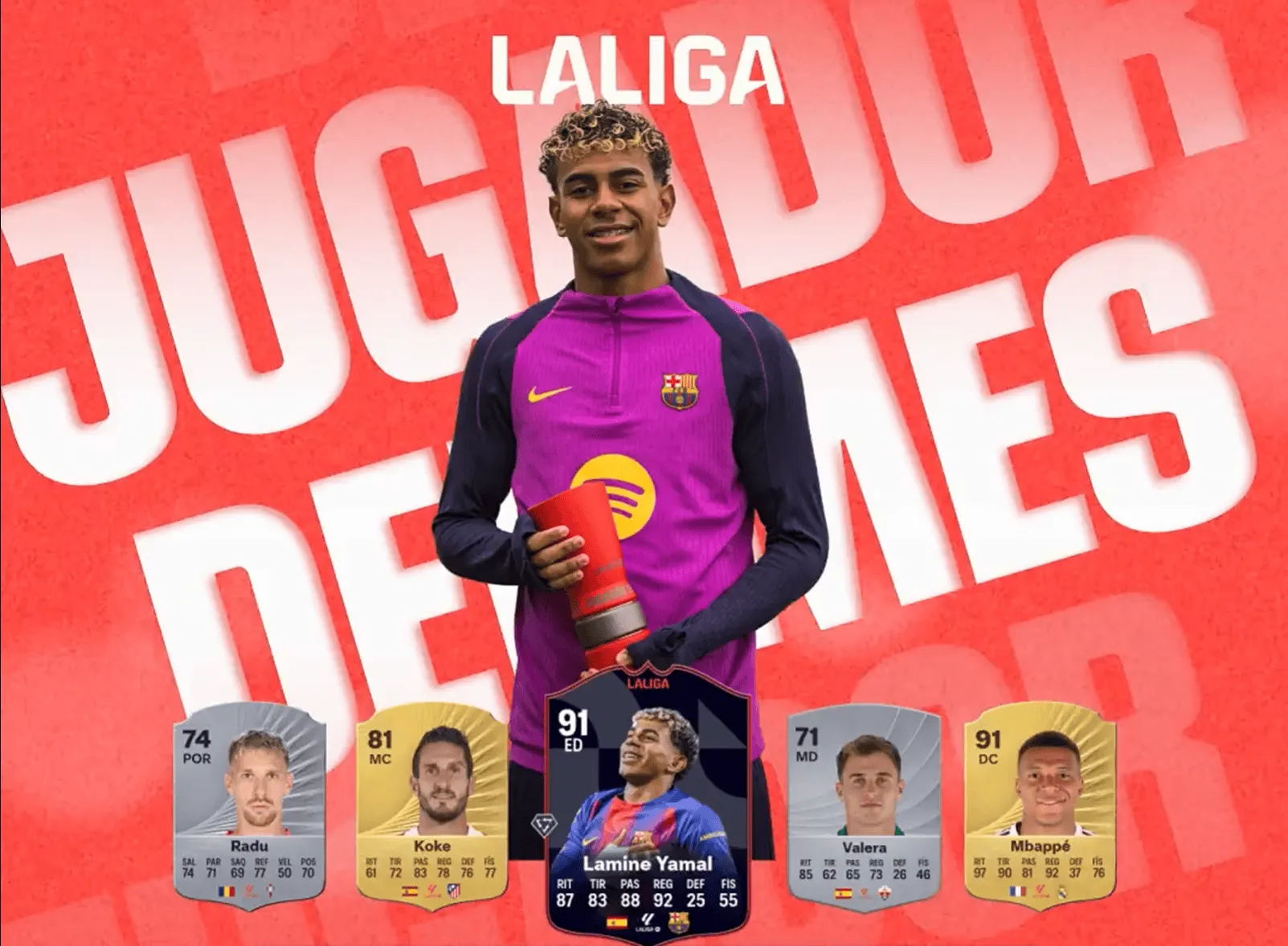 虎扑01月10日讯 官方消息,巴萨前锋亚马尔当选西甲12月最佳球员,这也是他连续第2个月获奖。