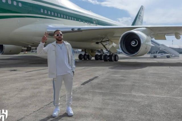 8月19日,内马尔正式亮相沙特利雅得新月。当天,他乘坐沙特王室专机由巴黎飞抵利雅得。那是一架波音747,是世界上最豪华的飞机之一,价格高达1.8亿欧元。它一共有两层,可以乘坐400人。飞机上有皮沙发、餐厅、酒吧和多个套间。这架飞机属于沙特王子阿尔瓦利德·本·塔拉尔领导的沙特王国控股公司,专供沙特国王及其家人使用。一下飞机,还在停机坪上,内马尔就受到热烈欢迎,收到了鲜花和掌声。